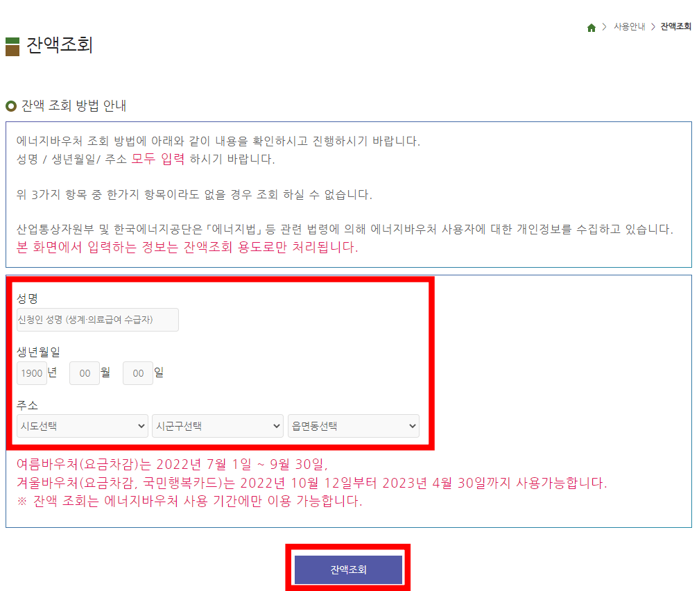 에너지바우처 잔액조회는 에너지바우처 사용기간에만 조회가 가능합니다