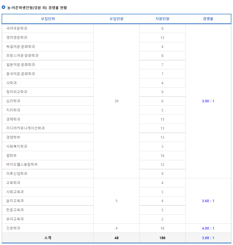 2023학년도 성신여자대학교 정시 농어촌학생전형(정원 외) 경쟁률 현황은 모집인원 48명, 지원인원 186명, 경쟁률 3.88:1 입니다.