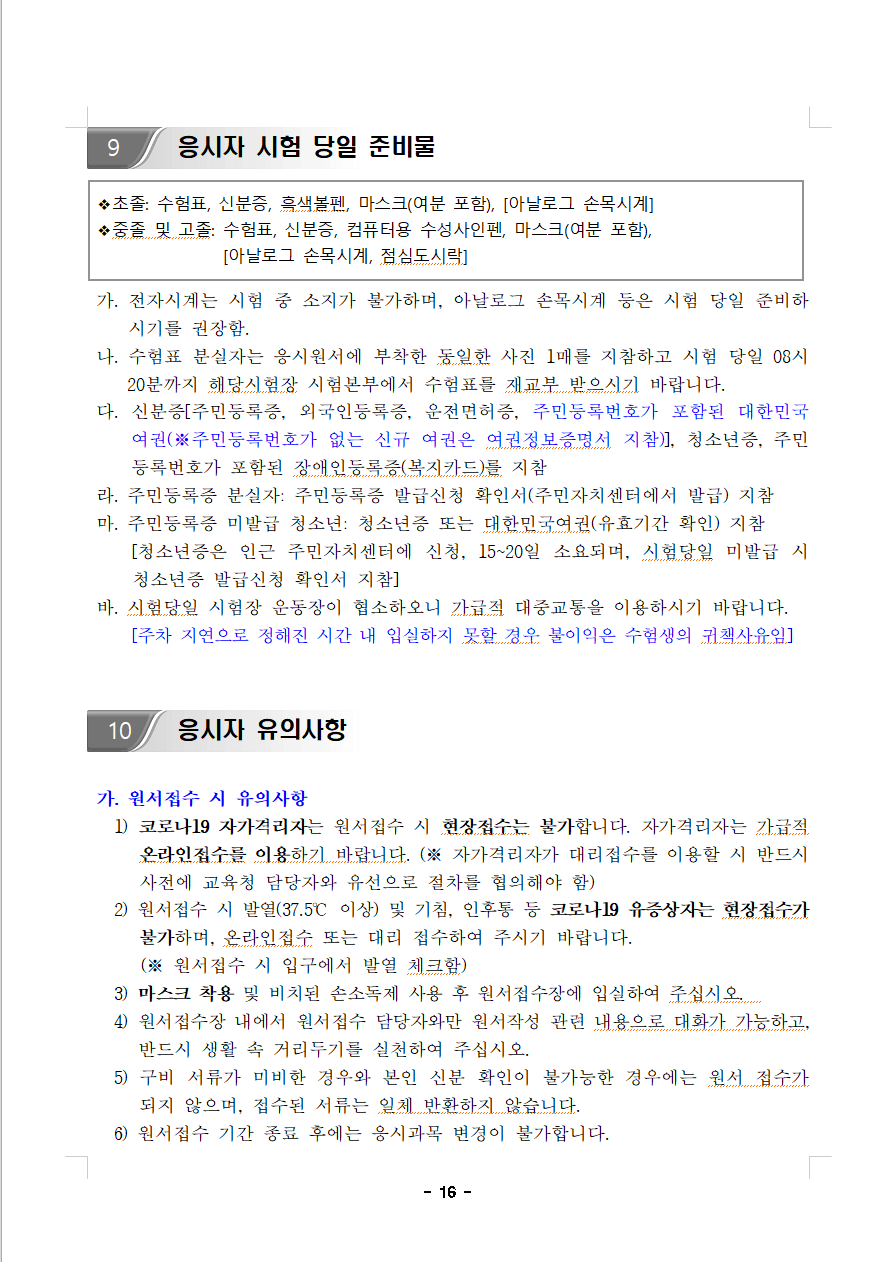 중졸 및 고졸: 수험표, 신분증, 컴퓨터용 수성사인펜, 마스크(여분 포함),