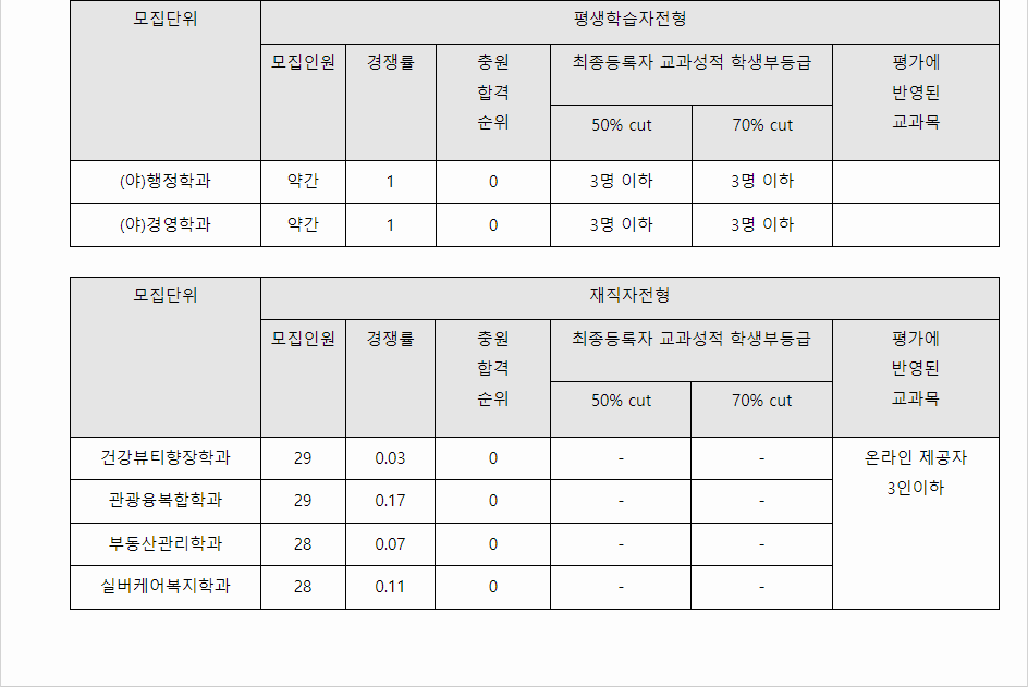 2023학년도 제주대학교 학생부종합전형 평생학습자전형 / 재직자전형 결과