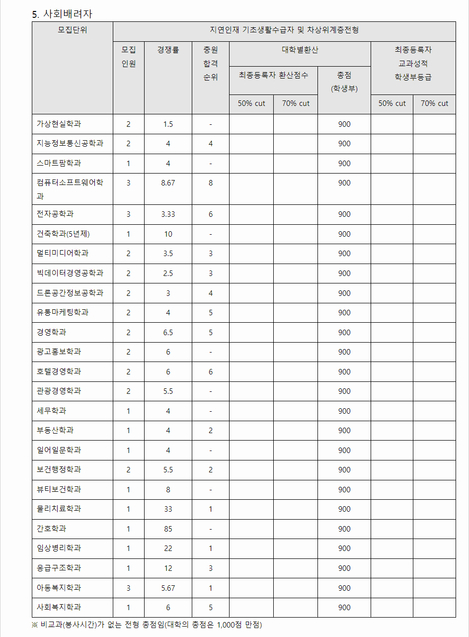 2023학년도 남서울대학교 학생부교과전형 지역인재 기초생활수급자 및 차상위계층전형 결과