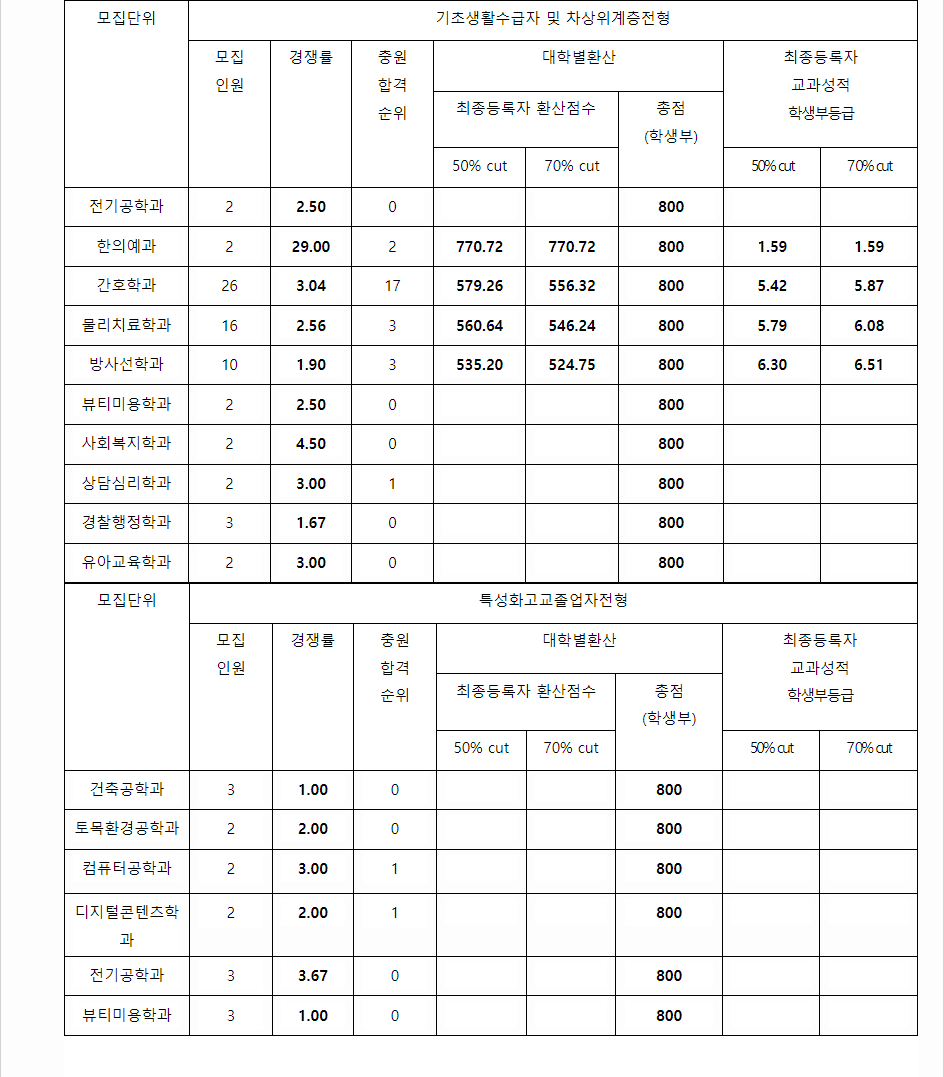 2023학년도 동신대학교 학생부교과전형 기초생활수급자 및 차상위계층전형 / 특성화고교졸업자전형 결과