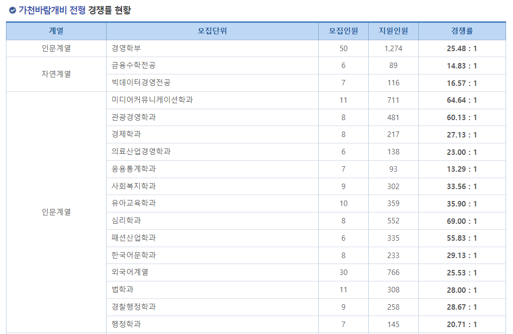 2024학년도 가천대학교 수시 전형 가천바람개비 전형 경쟁률 현황