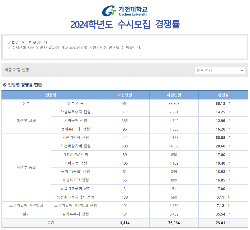 이번시간에는 2024학년도 가천대학교 수시 전형 경쟁률 현황에 대해 알아보았습니다