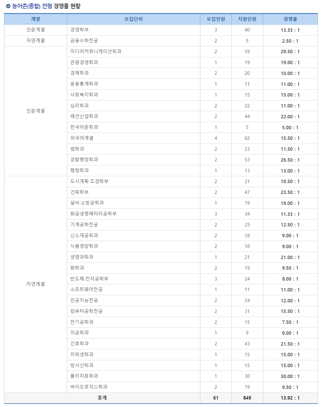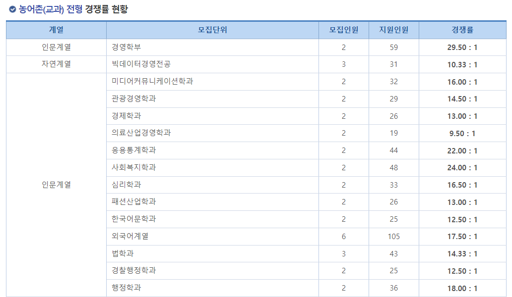 2024학년도 가천대학교 수시 전형 농어촌(종합) 전형 경쟁률 현황