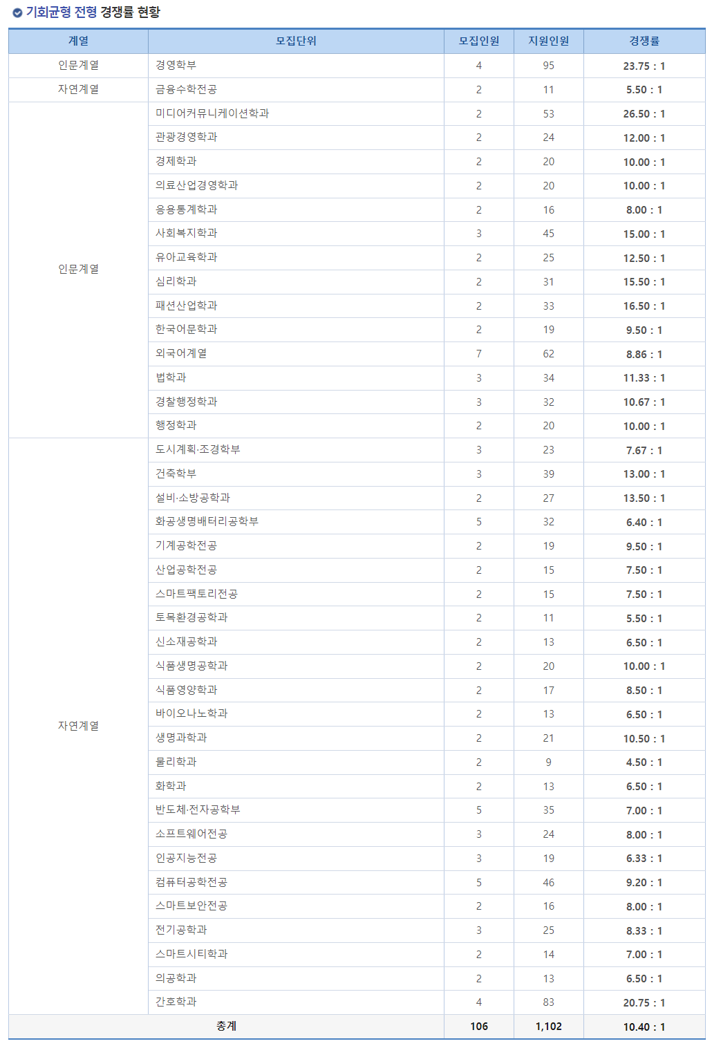 2024학년도 가천대학교 수시 전형 기회균형 전형 경쟁률 현황