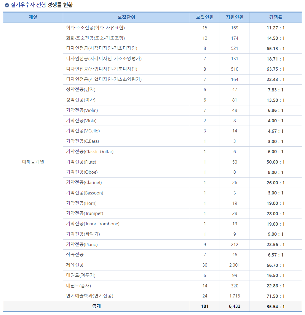 2024학년도 가천대학교 수시 전형 실기우수자 전형 경쟁률 현황