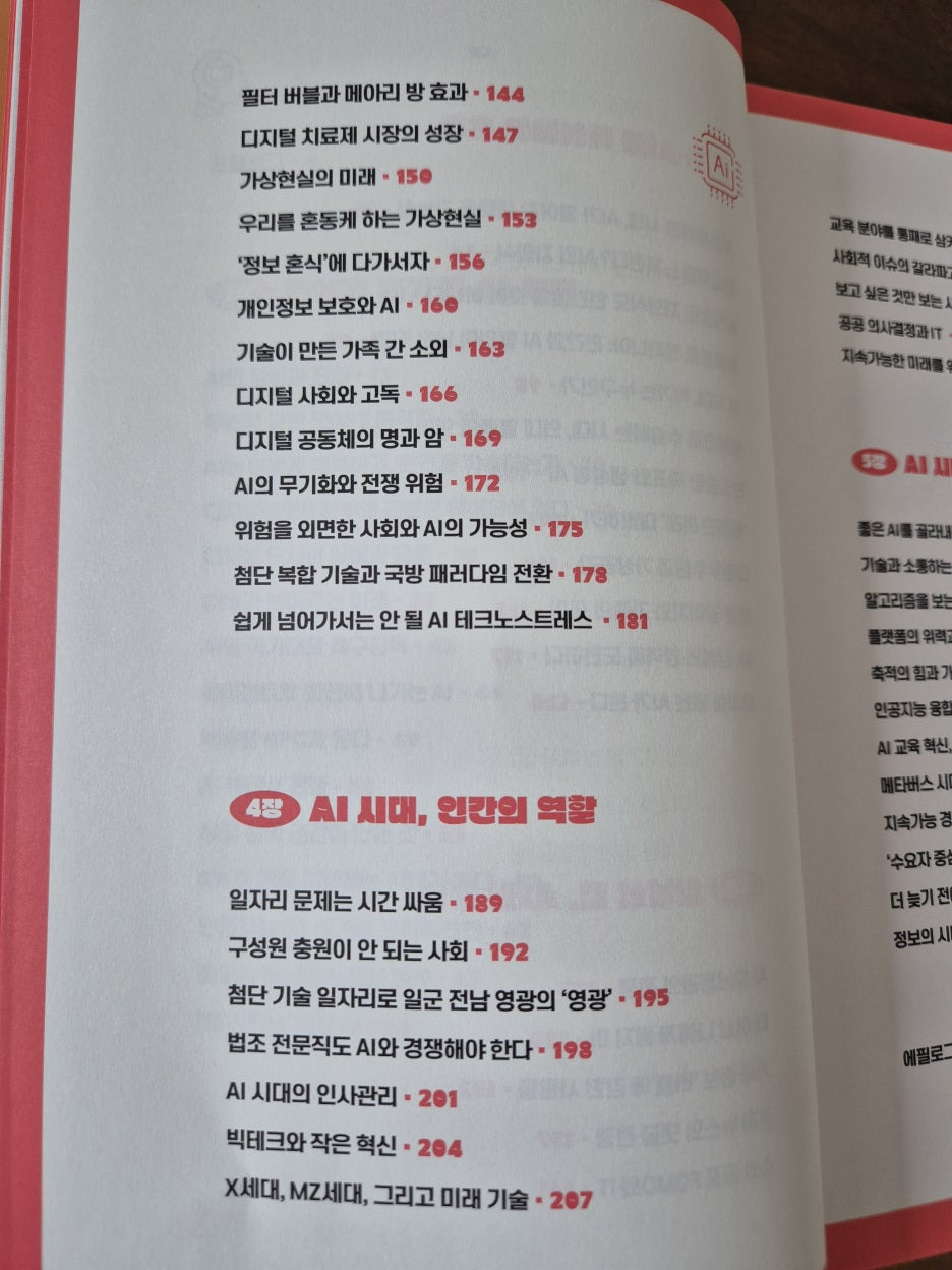 인공지능 시대의 변화와 인간의 역할을 주제로, 각 장마다 사회·기술·윤리·교육 등 폭넓은 이슈를 쉽게 풀어내고 있습니다
