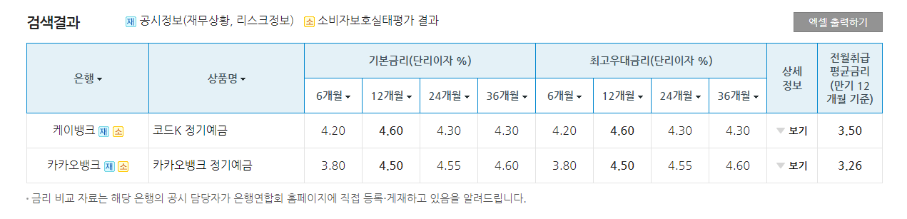 인터넷 은행인 케이뱅크와 카카오뱅크 정기예금 상품 금리비교에서는 12개월에서는 케이뱅크가 높으며 36개월에서는 카카오뱅크가 높은 것을 알 수 있습니다.