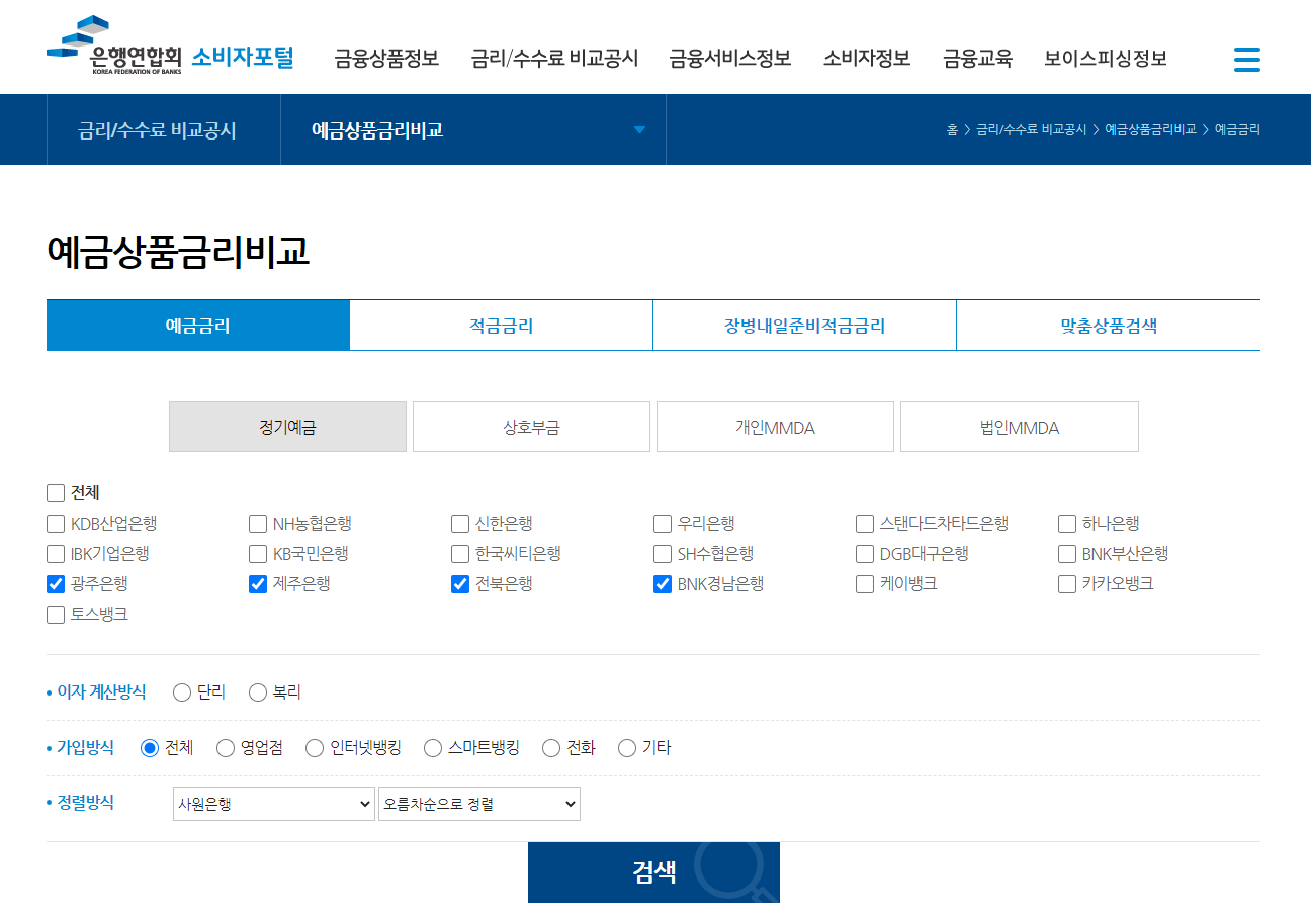 이번에는 지역은행 중 광주은행, 제주은행, 전북은행, BNK경남은행 정기예금의 예금금리 비교해 보겠습니다. 이자 방식은 단리로 선택하고 가입방식은 전체를 선택 후 검색을 하겠습니다.
