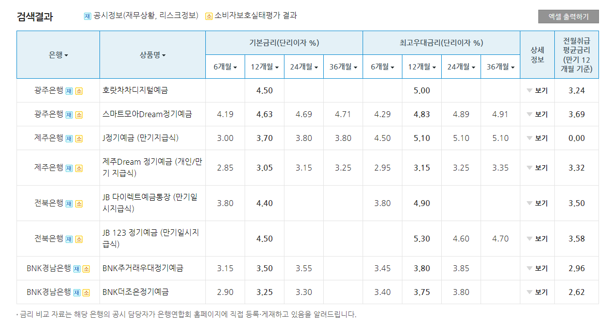 1. 광주은행, 제주은행, 전북은행, BNK경남은행 정기예금 금리비교