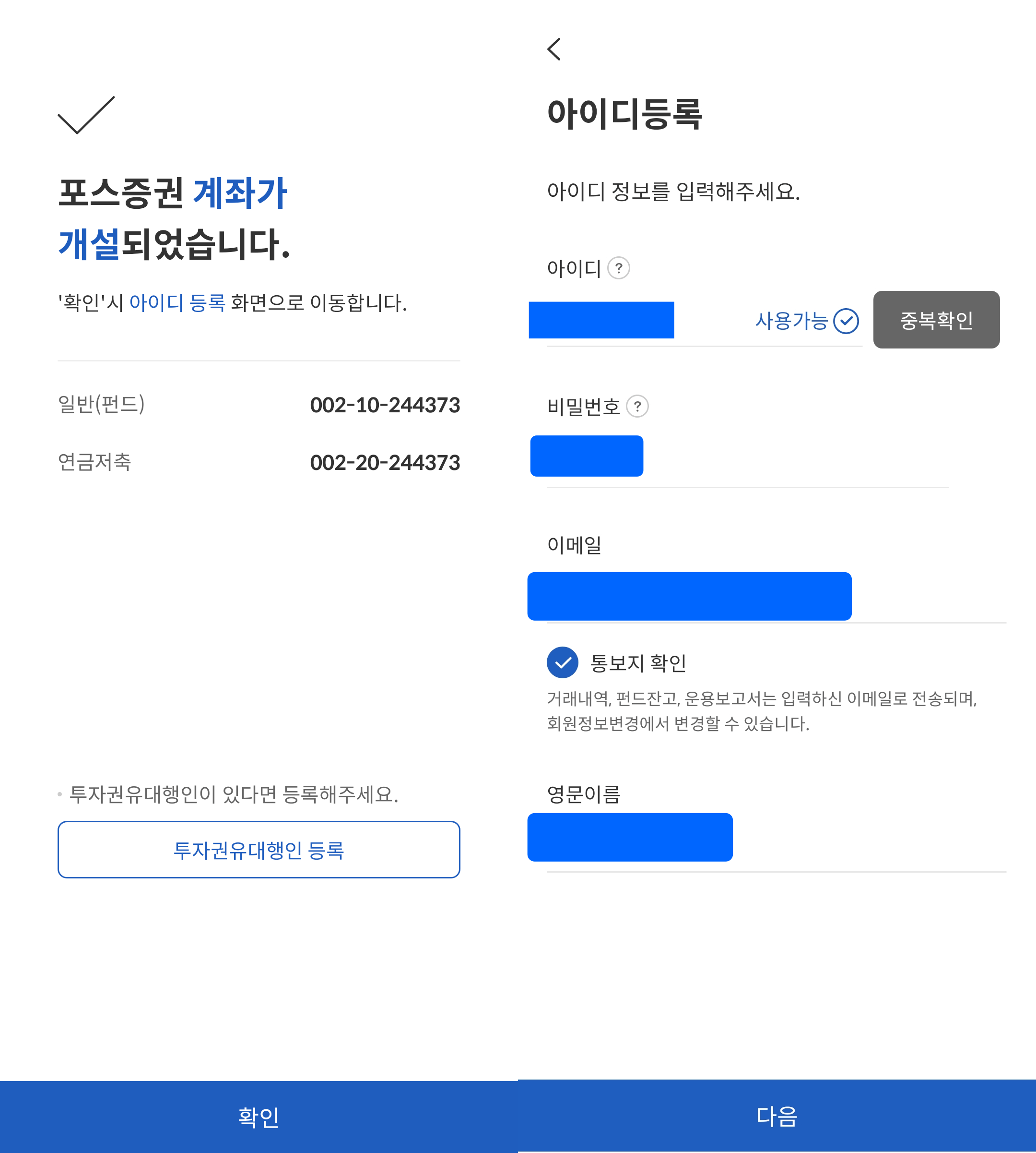 신분증 촬영 후에 본인 소유 계좌 확인 작업을 거치면 포스 증원 계좌 개설이 마무리됩니다. 그다음으로는 아이디 등록 화면으로 이동됩니다. 아이디는 영문과 숫자로만 가능합니다. 아이디와 비밀번호 그리고 이메일과 영문 이름을 넣으시면 포스 증권 아이디 개설이 됩니다.