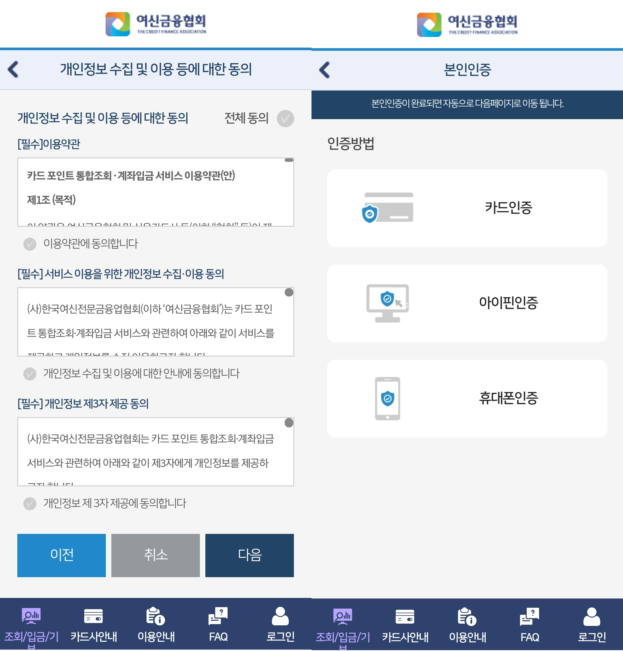 개인정보 수집 및 이용 등에 대한 동의에서 전체 클릭을 해주시면 본인인증 화면으로 이동됩니다. 개인별 본인인증을 해주시면 위위 동의서 화면을 거쳐 카드사 통합조회 화면으로 이동하여 포인트 조회와 계좌 입금을 하실 수 있습니다.